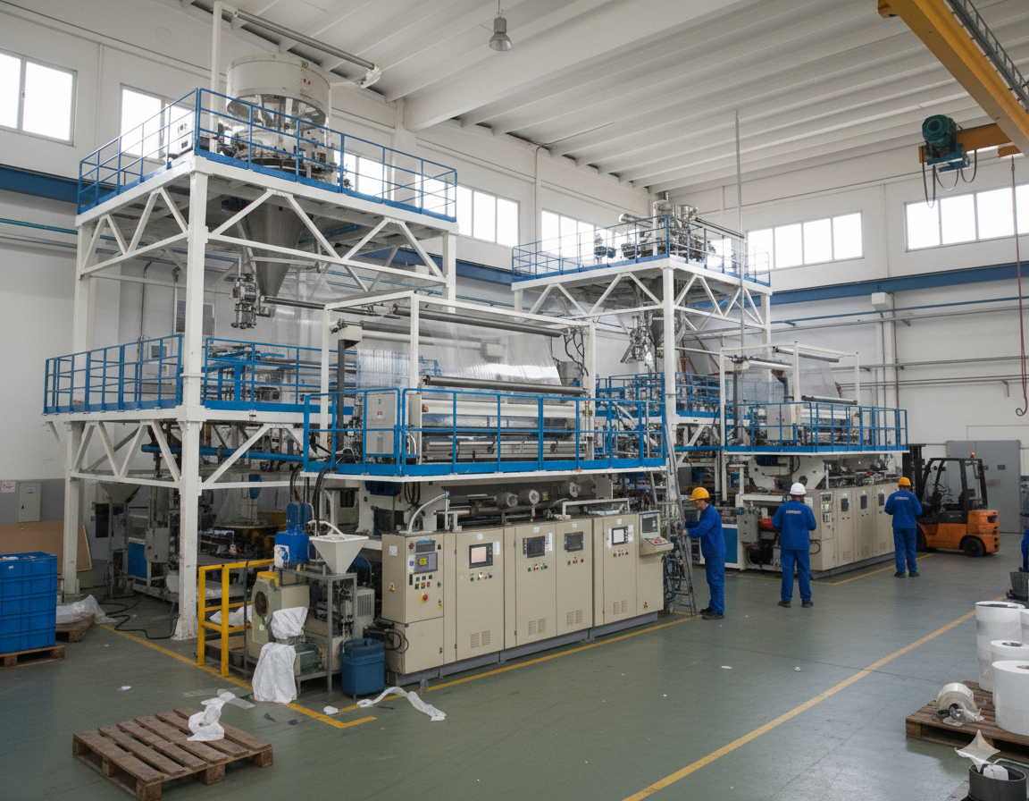 Machinery Supplied: Twin-Screw Extruder (Co-Ex 5-Layer System), Automatic Gravimetric Dosing Units, Rotating Die Heads, Surface and Gap Winders, and Corona Treatment Unit.