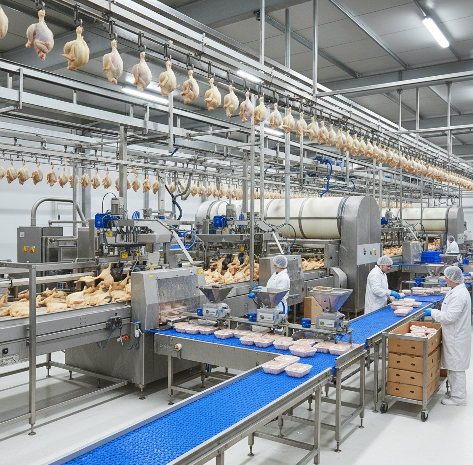 Scope of Work: Supply of a high-speed, fully integrated processing line from chilling to final cut and portioning, designed to handle 8,000 birds per hour while ensuring strict cold chain management.